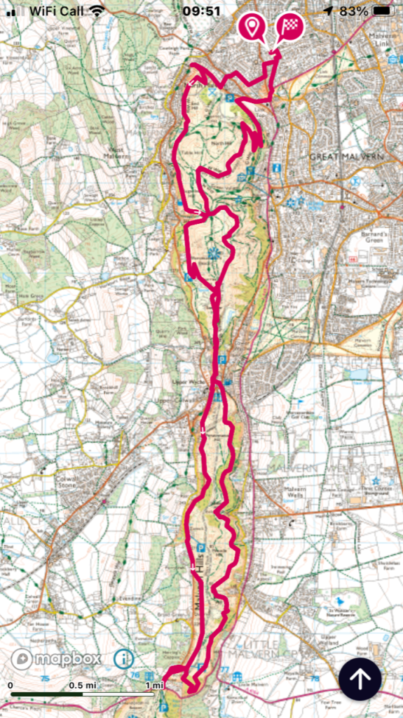 The first full week of the sabbatical has been full of learning. Happily the river Lugg and the general water logged state of the ground saved me from attempting an over-ambitious expedition for my first set of training walks. Instead, my sights switched to the Malvern Hills and on Wednesday and Thursday I puffed and wheezed my way to the British Camp and back.