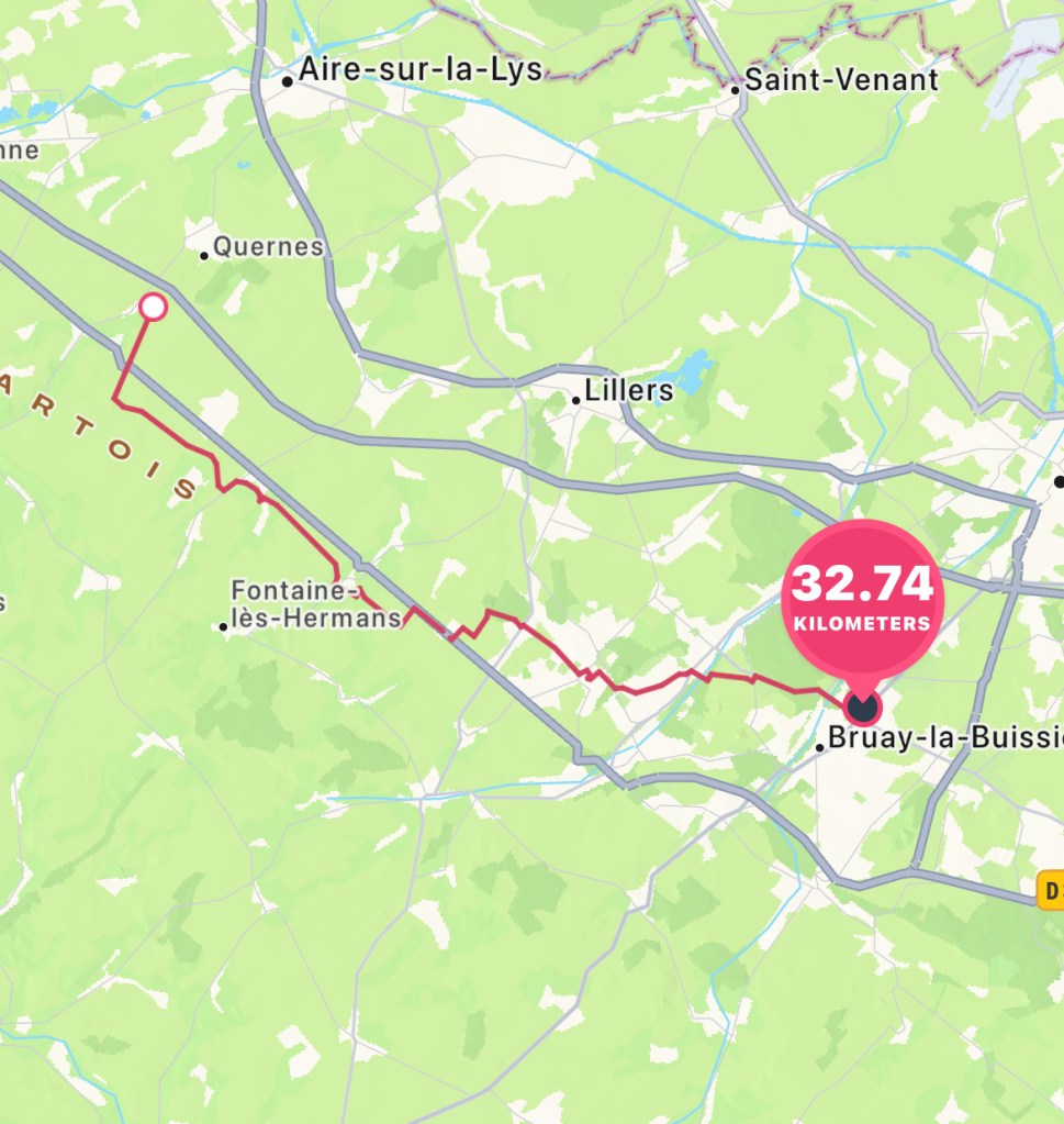 I walked from Liettres to Amette: the end of one stage and then, bypassing Bubure headed for the end of the second stage, Bruay. A total distance of 32 km (20 miles). The last 7 km were hard work! Once again, for a good proportion of the route I walked alongside the Chaussee Brunehut.