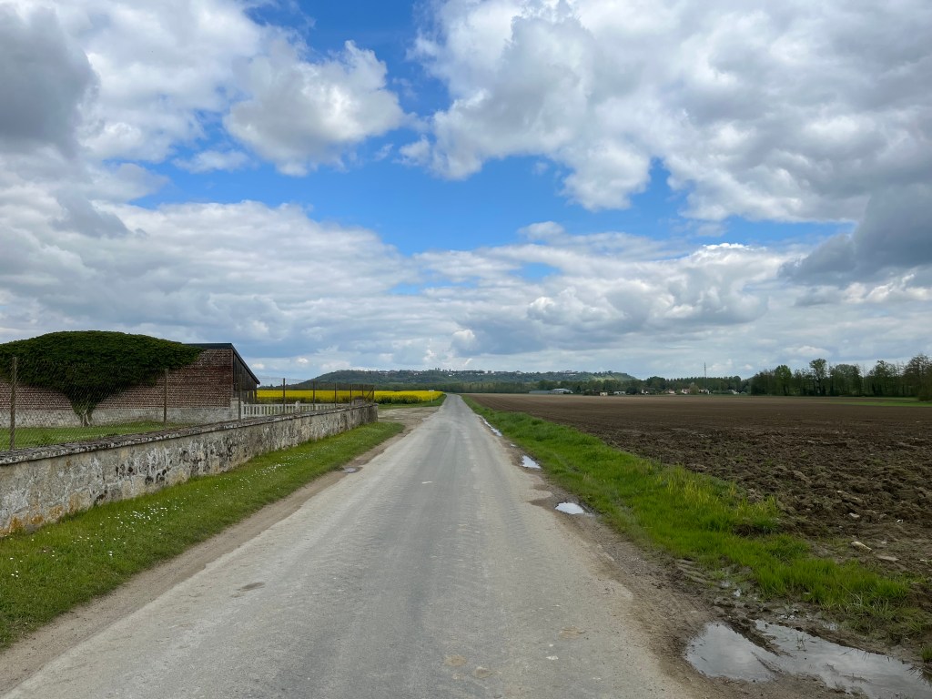 I had long been aware that this leg would be challeging. The official stage is Tergnier to Laon, which is an eye watering 39.5km. I had reduced this by at least 7km by staying at Charmes and I fully intended to take some further road shortcuts to reduce it further. Therefore I took the D55 out of Charmes direct of Bertaucourt-Epourdon and then continue on this road all the way to St Nicolas-aux-Bois, thus saving at least another 5km.