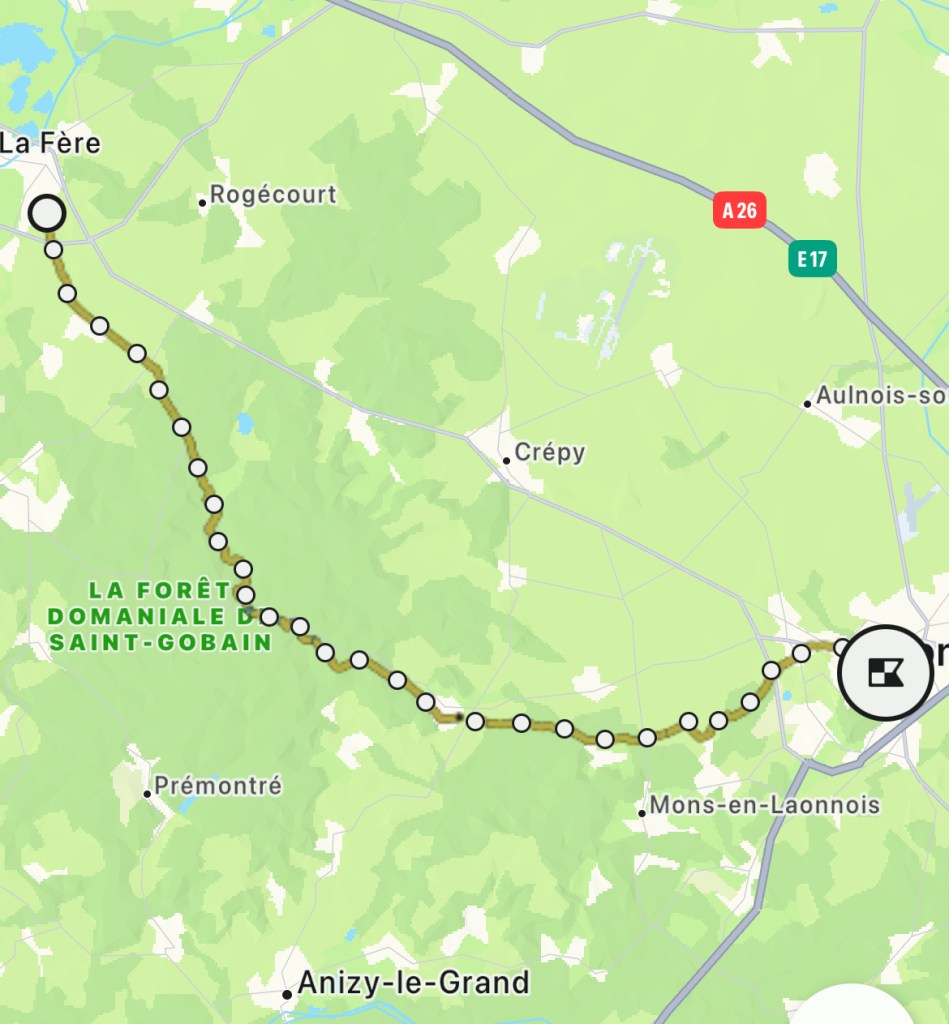 As I approached Bertaucourt, I was aware of a figure, with back pack and walking sticks approaching along the ridge at right angles to the road that bore the official path. He or she was a good 700 yards in front of me, and walking at a fair pace. Despite averaging 5km/hr at this point, I was not able to catch them up before they headed right again on the official route which took them into the woodland of the Forêt de Saint-Gobain. I would, I was certain, see them again because my shortcut would put me in front of them.