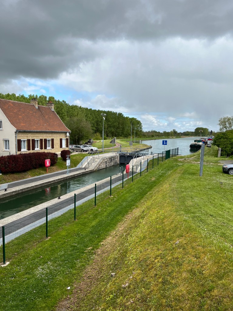 Finishing my lunch, I felt conspicuous walking down the street, and hurried out of town, over first the river Aisne and then the Canal Latéral à l’Aisne. Here there were a number of working boats moored, and I spotted a dog walker, reassuring me that the rapture had not occurred and I had not missed the boat.