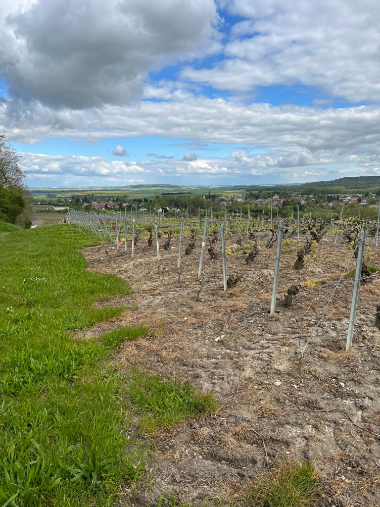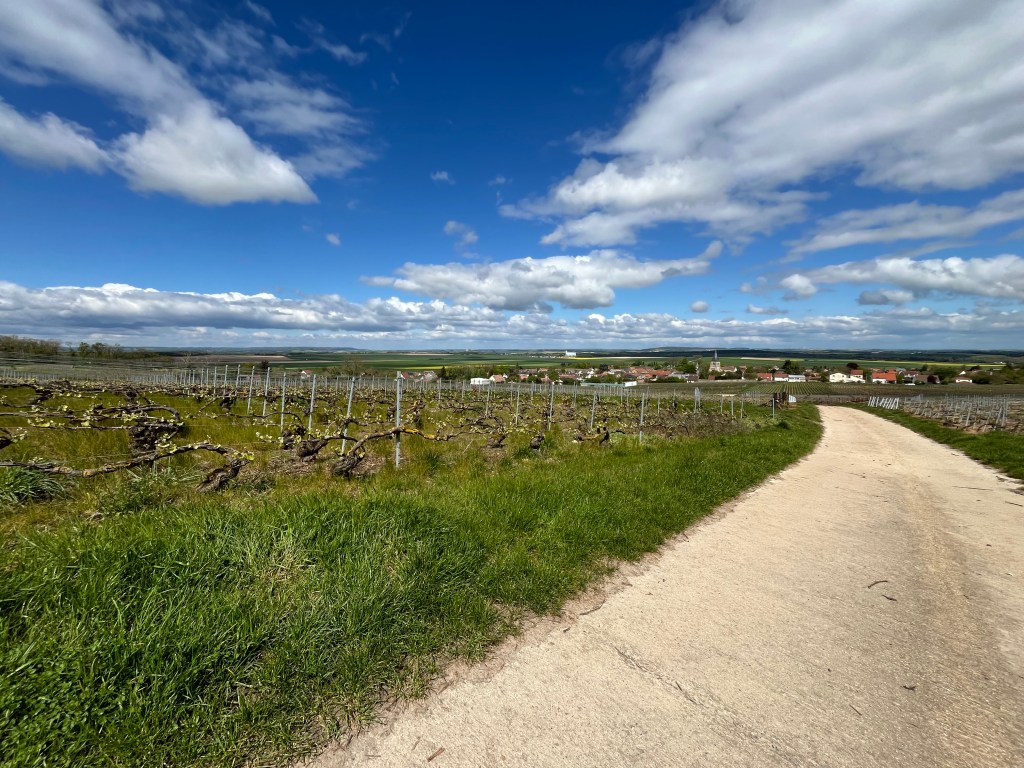Crossing the Aisne also meant crossing a regional boundary. I left the Hauts-de-France region and entered the Grand-Est region, and the Marne départment. I took the D530 shortcut direct to the hillside village of Cormicy, now listening to The Reunion on Radio 4, which dealt with the Port Talbot Passion Play. (Another belter of a listen). Behind the village I entered my first vineyard of the pilgrimage and noted the regular rows of vines stretching off into the distance. As well as moving administrative region, I was now also entering champagne region!