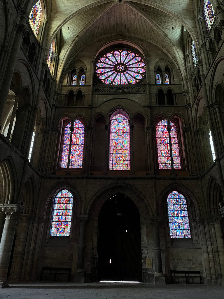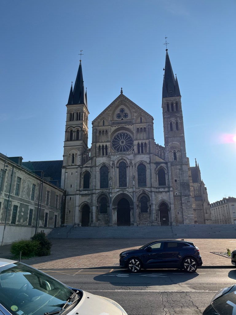 I walked a little way on down the rue Gambetta and sat to break my night’s fast in a little park behind the Basilica of Saint Rémi. This wonderful Romanesque church looked resplendent in the golden morning sun, and I reproached myself for not exploring it when I had the opportunity the previous day. It looked far more appealing than the overdone Gothic fussiness of the Cathedral of Notre-Dame up the road.