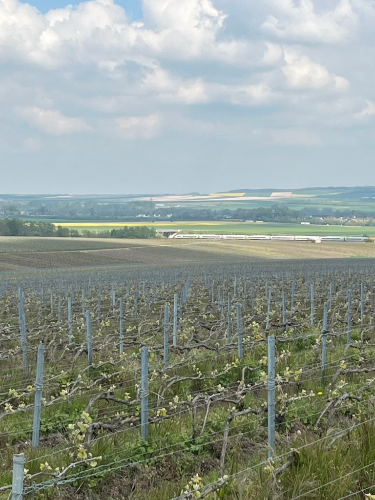 I did manage to take this one a little later. And as the foreground of this picture suggests, I was now among the pinot noir vines that produce some of the most expensive champagnes France has to offer. Famous names appeared on posts as I walked through the vineyards – Mailly, Moët & Chandon, G H Mumm to mention a few. Of course at the moment only the first leaves are starting to appear on the vines, there aren’t any grapes yet, but strange to think that in subsequent years people will be wetting baby’s heads, saluting brides and grooms and even naming ships with the produce of these plants.