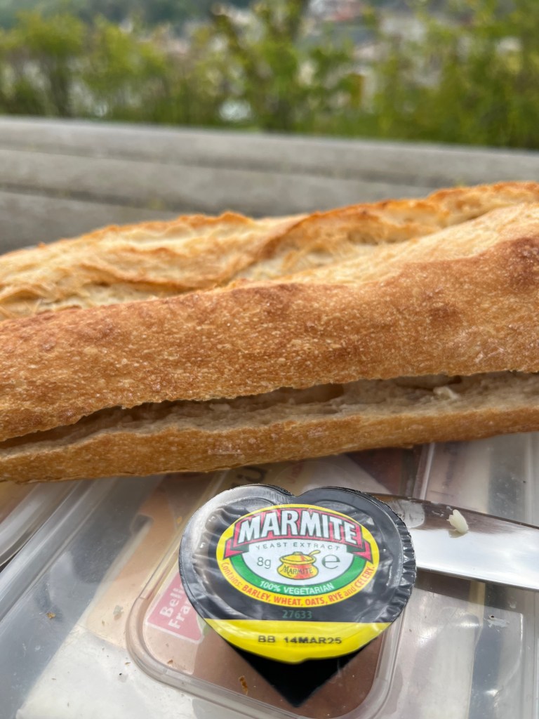 It was 1.45pm and very definitely time for lunch. I had a baguette and some cheese and, as it was St George’s Day, something that all true born Englishmen and women either love or hate to go with it.