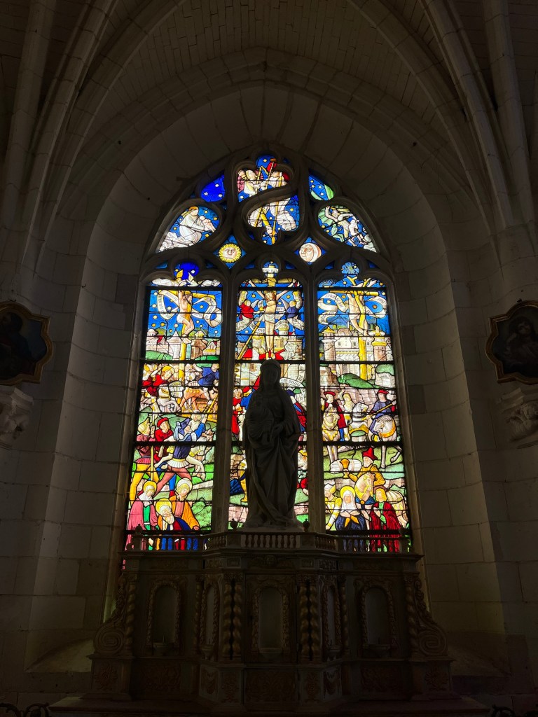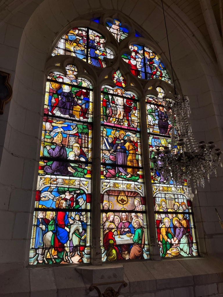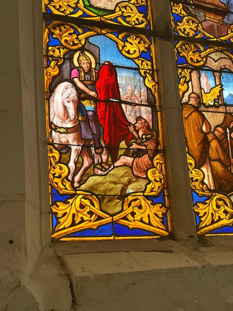 There was some particularly vivid stained glass here too. Including several panels telling the story of their patron, St Martin. This soldier was supposed to have encountered a beggar on the road who is in the middle of freezing to death. Taking his sword, and perhaps mindful of Jesus’ words that what one does to least of us, we do to him, he cut his cloak in two and gave half of it to the beggar.